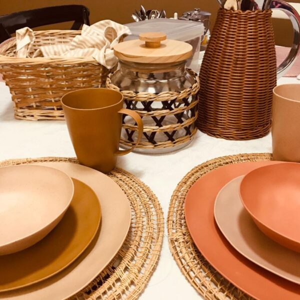 Os americanos em fibra natural possuem uma flexibilidade de uso, sendo possível compor centros de mesa, composições na parede para decorar, e usá-los na mesa posta.