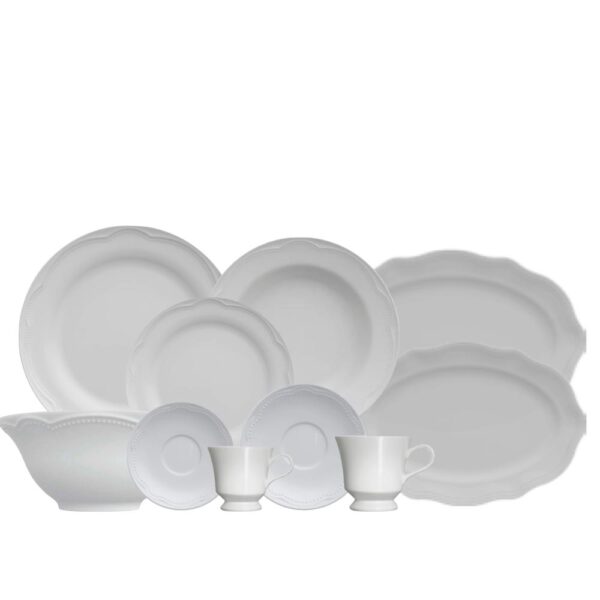 Composiçao; 6 Pratos Rasos, 6 Pratos Fundos, 6 Pratos Sobremesa,6 Xicaras de Cha, 6 Xicaras de Café,12 pires, 6 Bowls, 2 Travessas 34×24 cms, 2 Travessas 28x19cms cada