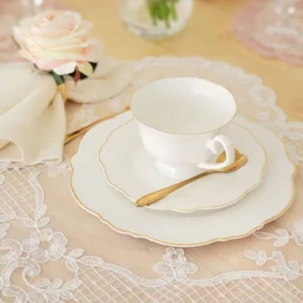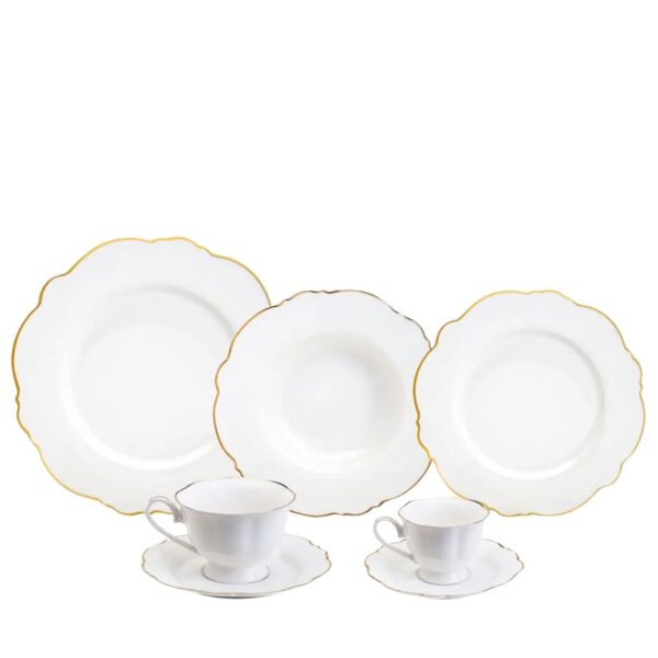 Cada peça é meticulosamente elaborada em porcelana fina, conhecida pela sua durabilidade e brilho incomparáveis. O toque especial fica por conta do filete dourado que adorna cada item, conferindo um brilho sutil e uma aura de luxo que eleva qualquer refeição a uma celebração.
