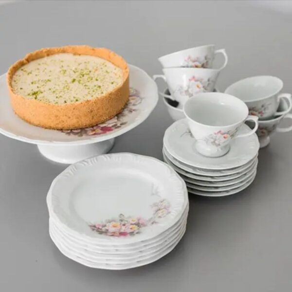 O conjunto é composto por 30 peças, incluindo 6 xícaras de chá, 6 pires, 6 pratos rasos, 6 pratos de sobremesa e 6 pratos Fundo. Todas as peças são fabricadas em porcelana de alta qualidade, que garante durabilidade, resistência e beleza.
