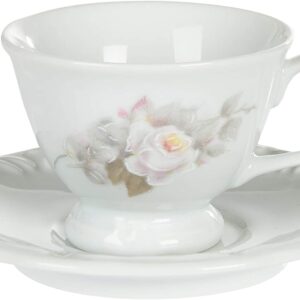 O design do Aparelho de Jantar Chá Eterna é clássico e atemporal, com uma estampa delicada em tons de verde, rosa e amarelo. As peças possuem acabamento brilhante e detalhes em relevo que conferem um toque de requinte e sofisticação.