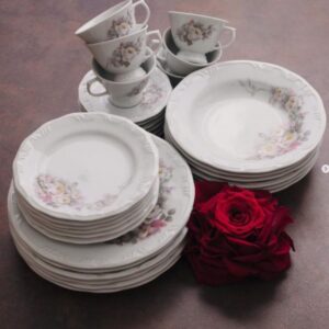 – Medidas: Prato Fundo 23 cm, Prato Sobremesa 19 cm, Prato Raso 26 cm, Xícara chá 200 ml, Xícaras de Café 80ml.