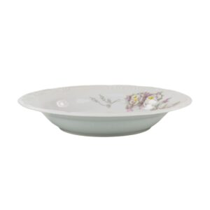 O design do Aparelho de Jantar Chá Eterna é clássico e atemporal, com uma estampa delicada em tons de verde, rosa e amarelo. As peças possuem acabamento brilhante e detalhes em relevo que conferem um toque de requinte e sofisticação.