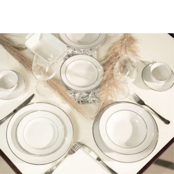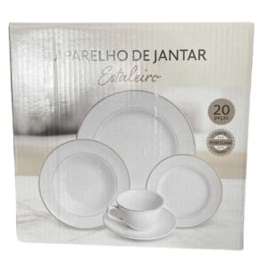 - O Aparelho de Jogo de Jantar Estaleiro é uma escolha elegante e sofisticada para complementar a decoração da sua mesa. Com sua borda prata, este conjunto de porcelana de 20 peças adiciona um toque de luxo e estilo à sua refeição.