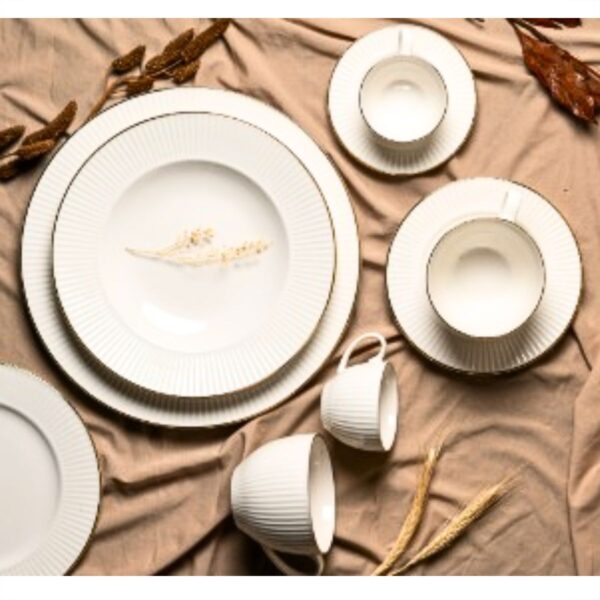 Combinação equilibrada: Para destacar o filete dourado das louças, procure criar um contraste equilibrado com outros elementos da mesa. Opte por uma toalha de mesa de cor neutra, como branco, creme ou cinza claro, para permitir que o dourado se destaque. Evite padrões ou estampas muito chamativas, para não competir com o brilho sutil do filete dourado.