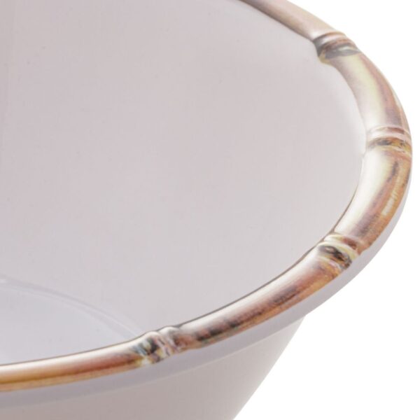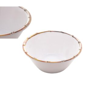Observação: Estes Pratos não são de Porcelana, são de Melamina que é um Tipo de Plastico Duro e Resistente. São duráveis e leves podendo ser usado para refeições e em lugares que as pessoas precisam de mais praticidade, na piscina, na fazenda , na churrasqueira, para crianças.Tem a cor branca e a borda pintada de bambu.