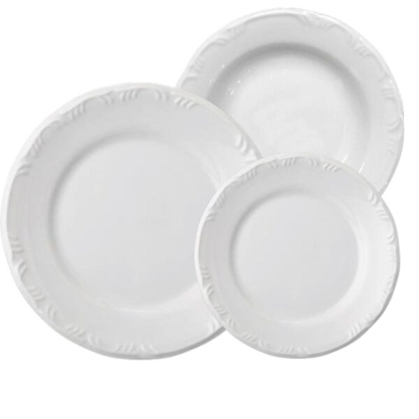 Contem 6 un Pratos Rasos 26cms, 6 un de Pratos Fundos 23cms, 6 un de Pratos Sobremesa 19cms