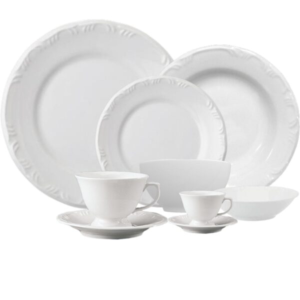 Contem 6un Pratos Rasos 26cms, 6un de Pratos Fundos 23cms, 6un de Pratos Sobremesa 19cms, 6un de xicaras de Chá de 200ml,e 6 pires, 6un de xicaras de café de 70ml e 6 pires, 6un de Bowls com 400ml, 6un de Saladeirinhas com 200ml cada.
