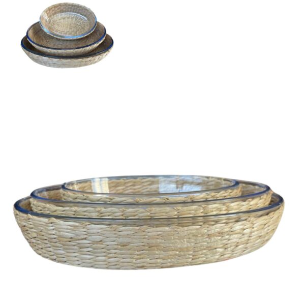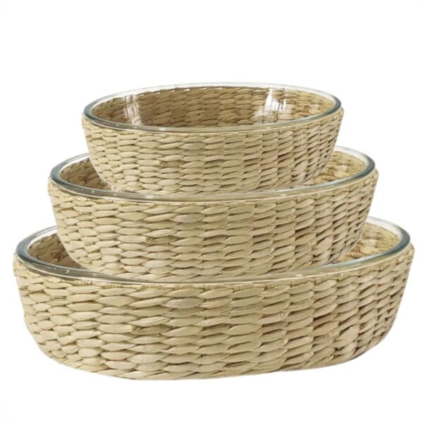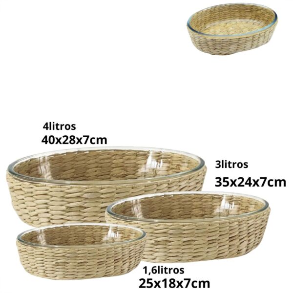 Assadeira e Travessa Refratárias Vidro 3un 4lt.,3lt.,1,6litro com Suporte de Rattan