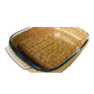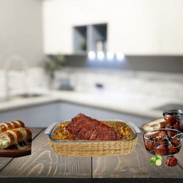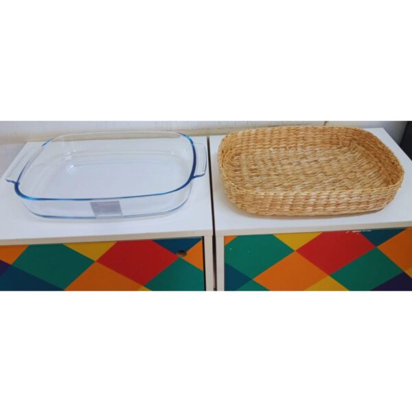 O suporte de rattan é outro elemento que aprimora a funcionalidade do conjunto. Além de servir como uma base estável para as travessas e assadeiras, também adiciona um toque de charme e elegância à apresentação das refeições. O rattan é um material resistente, leve e de fácil manutenção, o que o torna ideal para uso na cozinha.