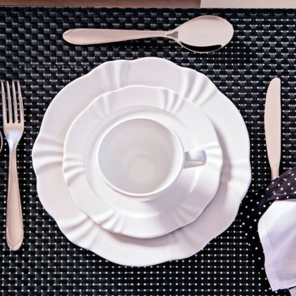 As formas clássicas que nunca saem de moda ganham uma releitura moderna e sofisticada no modelo Soleil da Oxford. Garantia de uma mesa harmoniosa com um toque de nobreza. O branco é versátil e permite vários tipos de combinação numa decoração. Além disso, é ideal para quem gosta de deixar o destaque da refeição para os alimentos servidos.
