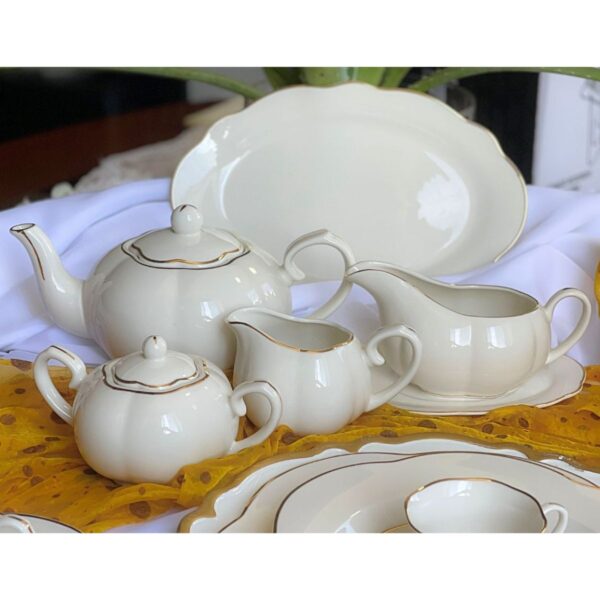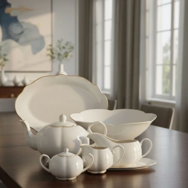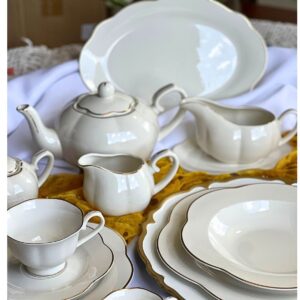 O conjunto apresenta um acabamento refinado com detalhes em dourado, contrastando com o branco clássico da porcelana New Bone China. As bordas suaves e os contornos elegantes das peças trazem um toque de requinte, transformando qualquer refeição em uma experiência luxuosa