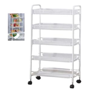 Com 5 prateleiras amplas, resistentes, e com bordas e fundo de superfície vazada, este carrinho permite a eliminação de resíduos líquidos e suporta até 20 kg por prateleira. Disponível nas cores branco e preto, adapta-se facilmente a qualquer estilo de decoração.