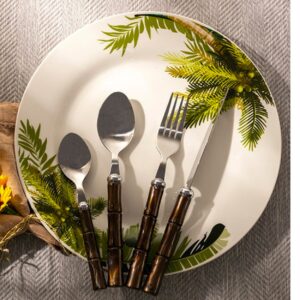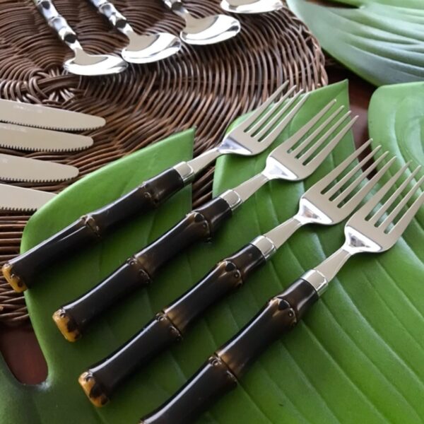 Os cabos dos talheres são projetados para reproduzir fielmente a aparência e a textura do bambu, adicionando um toque de autenticidade à mesa posta.
