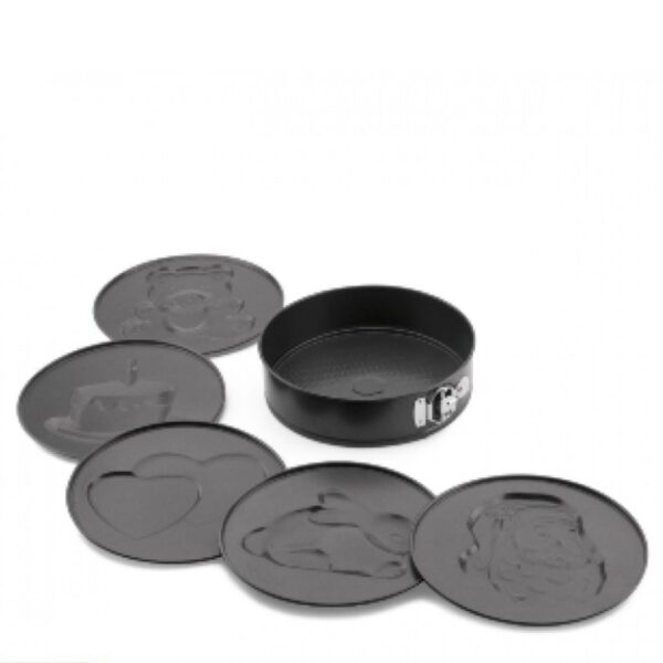 Conjunto de Forma antiaderente , com fundo removivel e fundo com moldes tendo 24cm de diametro e 7cm de altura.
