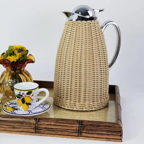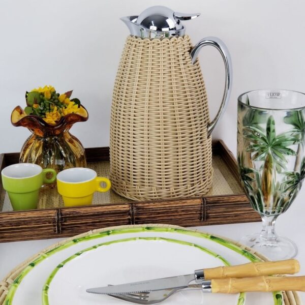 Feita toda em inox, essa garrafa é totalmente hermética, fazendo que a temperatura da bebida permaneça quente ou frio por mais tempo! Possui um lindo revestimento que imita o rattan, confere estilo e sofisticação a sua casa!