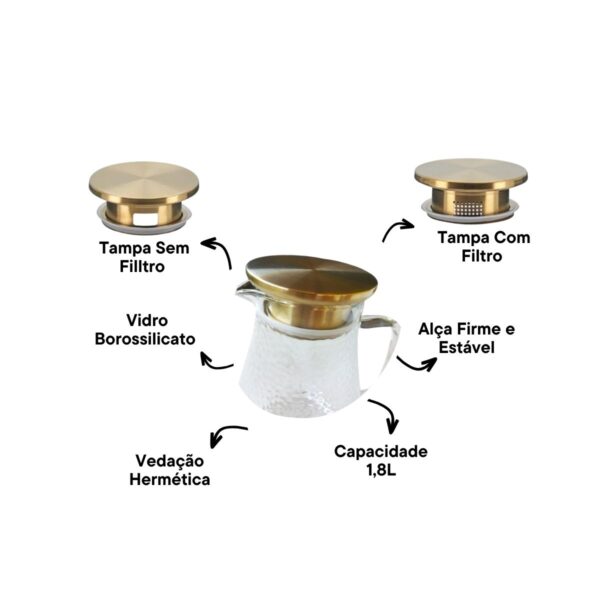 Além disso a tampa possui um filtro integrado. Esse filtro é um recurso extremamente útil, especialmente ao servir bebidas que contenham pedaços de frutas, ervas ou outros ingredientes sólidos. Ele atua como um peneirador, permitindo que você despeje o líquido da jarra sem que os sólidos passem para o copo. Isso é perfeito para preparar e servir água aromatizada com frutas frescas ou chás que contenham folhas soltas, por exemplo.