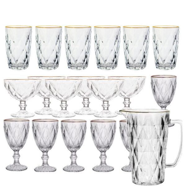 Jarra, Taça Agua e Sobremesa e Copo 19pç Diamond Fio de Ouro Lyor