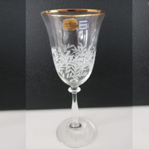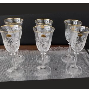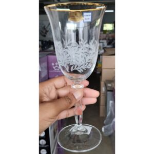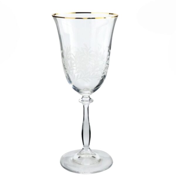 A lapidação delicada nas taças é combinada com uma decoração em ouro, criando um efeito deslumbrante de sofisticação. A borda dourada e os detalhes florais lapidados conferem um ar de elegância sutil, enquanto o cristal transparente exibe todo o esplendor da bebida servida.