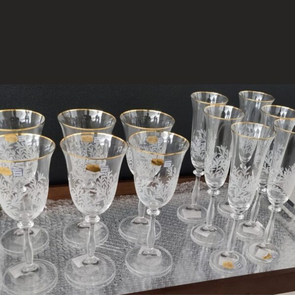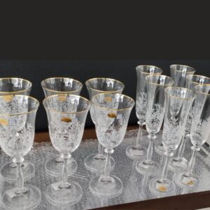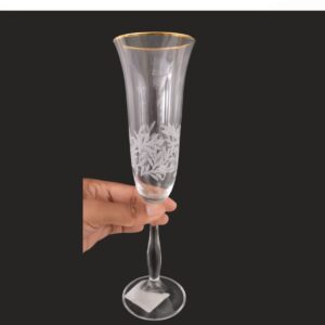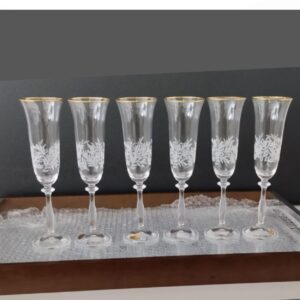 Cada taça é lapidada com padrões florais delicados e elegantes, com uma borda dourada que adiciona um toque de requinte e luxo. A combinação da lapidação refinada com a decoração dourada cria um equilíbrio perfeito entre o natural e o sofisticado, tornando o conjunto um verdadeiro objeto de desejo.