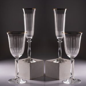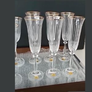 O grande destaque desse conjunto está no trabalho de lapidação e as bordas em ouro, um acabamento refinado que envolve a borda. O delicado detalhamento em ouro, com linhas suaves e intrincadas, confere um ar de luxo e exclusividade, tornando cada taça única. Esse toque dourado não apenas embeleza o cristal, mas também agrega valor e sofisticação, elevando a experiência de quem as usa.