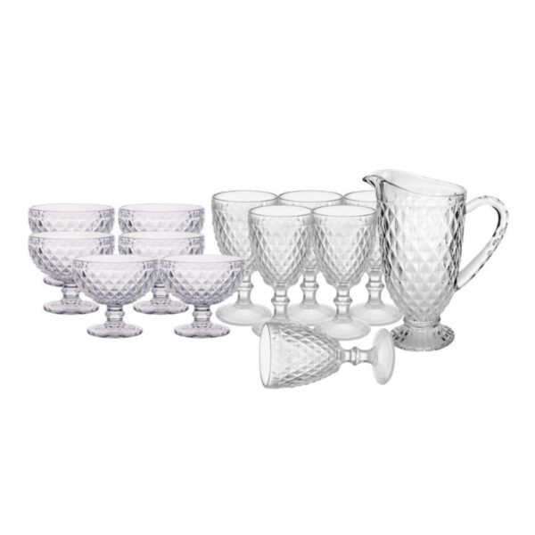 Especificações: Jogo de Jarra e Taças de Água e Sobremesa Bico de Abacaxi sendo 01un de Jarra com capacidade para 1,2 litro, 06un de Taças para Água com 325 ml cada e 06un de Taças para Sobremesa com 310ml cada,com total de 13pcs