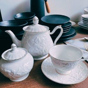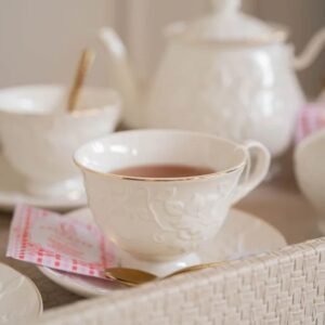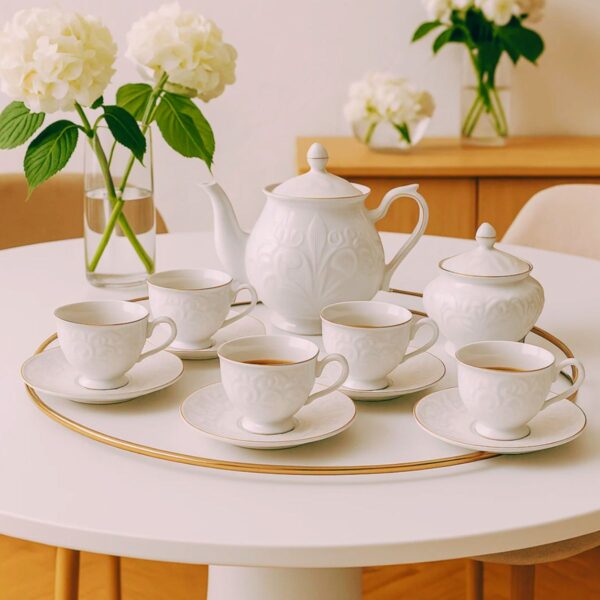 Elegância Duradoura: São peças finas na cor branca, enriquecidas com detalhes em dourado e relevos muito elegantes. Cada xícara e pires foi cuidadosamente desenhado para oferecer uma experiência visualmente deslumbrante, tornando qualquer reunião ou celebração ainda mais especial.