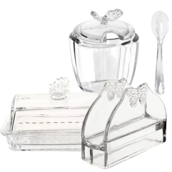 Contém: 3 Peças sendo: 1un Açucareiro 250ml, 1un Manteigueira 200ml, 1un Porta Guardanapo