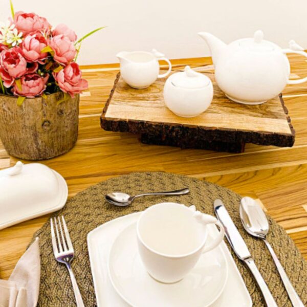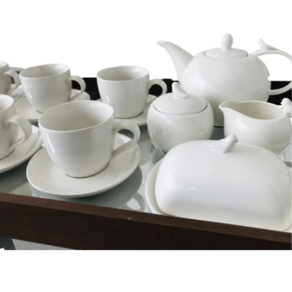 Contém: 1 Bule 860ml, 1 Leiteira 145ml, 01 Mantegueira 15x10x8cm, 1 Açucareiro 9x9x5cm e 6un de Xicaras Luiza Bon Gourmet 180ml cada.
