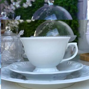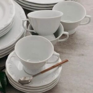 - 06 Xicaras para Chá de 200ml, 06 Pires ,06 Pratos para Sobremesa de 20cm, 2 Açucareiros com 300ml cada, 01 Cafeteira de 1.Leiteira de 1litro, 015litros, 01 Mantegueira com 300ml.