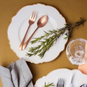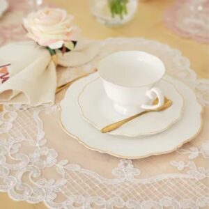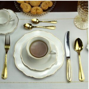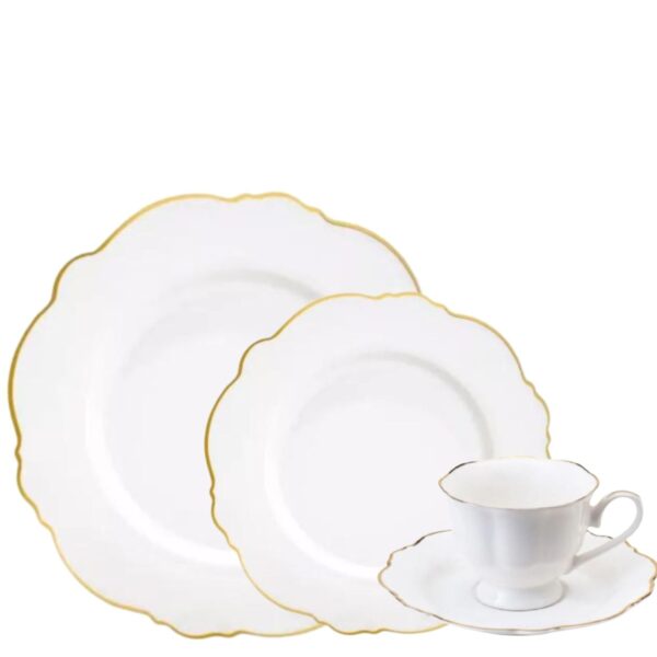 Feitos em porcelana branca pura, eles apresentam contornos suaves e um filete dourado delicado, adicionando um toque de brilho sutil às bordas. Esses detalhes refinados criam uma atmosfera encantadora durante as refeições, tornando cada prato servido uma experiência especial.