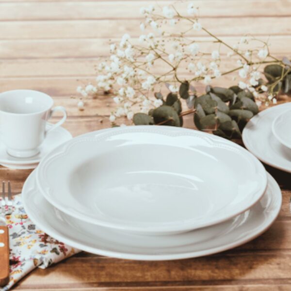Jogo com 6un Pratos Fundos, com diâmetro de 23cm na Porcelana Branca, Linha Cottage Germer. Uma linha com utensílios delicados e graciosos, em material resistente e fácil de limpar. Ideal para levar à mesa e impressionar os amigos e familiares.