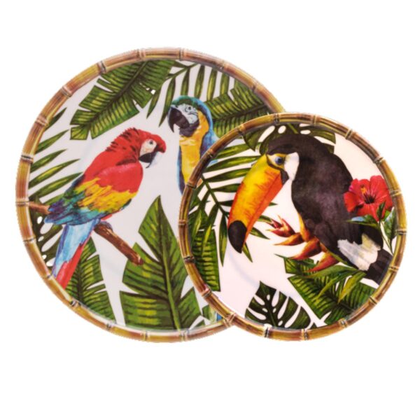 Obsevação: Estes Pratos não sao de Porcelana,são de Melamina que é um Tipo de Plastico Duro e Resistente.São duráveis e leves podendo ser usado para refeições e em lugares que as pessoas precisam de mais praticidade, na piscina, na fazenda , na churrasqueira, para crianças.Tem a Estampa de Arara e a borda pintada de bambu.