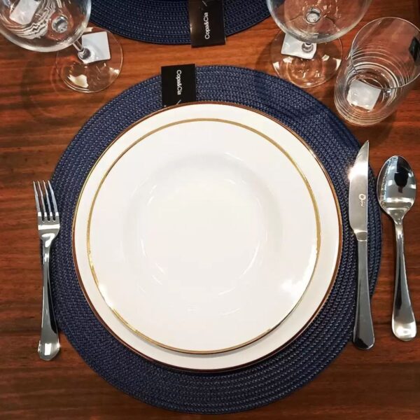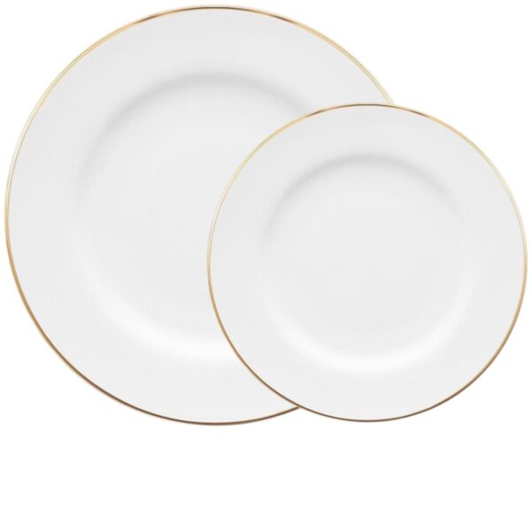 Composição: 6un de Pratos Rasos com 28cm de diametro e 6un de Pratos para Sobremesa com 22cm de diametro sendo de Porcelana Branca com Filete a Ouro por isto não pode ir ao microondas e não pode ir a lava-louças.