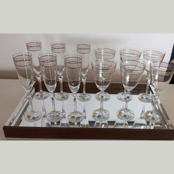 Contém 12 unidades de taças sendo: 6 Taças Para Champagne 220ml e 6 Taças Para Água 580ml