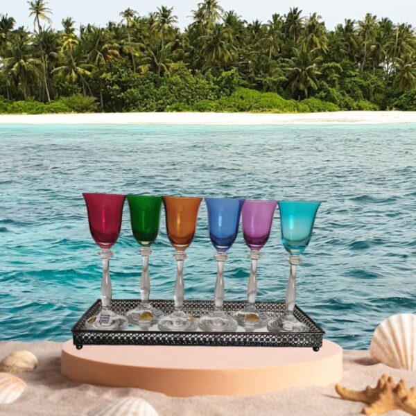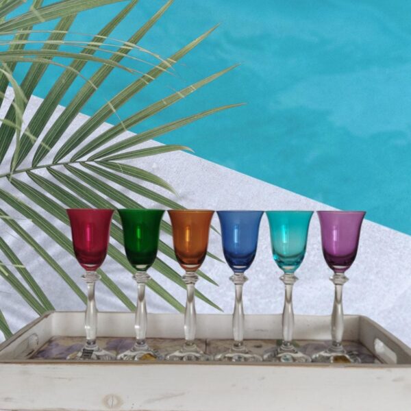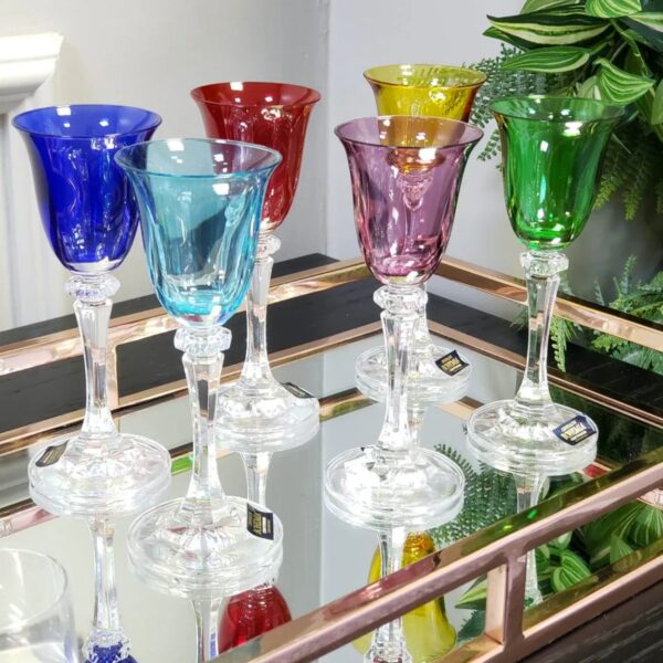- O Jogo de 6un Taças de Cristal coloridos para Licor da linha Angela trará o requinte e a sofisticação necessários para apreciar e servir uma das bebidas mais contempladas nas refeições. Em seis diferentes cores, ideal para servir os seus convidados e decorar aquela