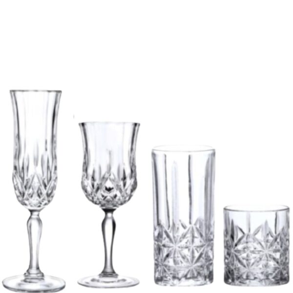 Composição; 06un Taças Champanhe com 130ml cada, 06un Taças para Vinho com 160ml cada, 06un Copos Long Drink para Água ou Suco com 260ml, 06un copo para Wisky com 300ml cada.