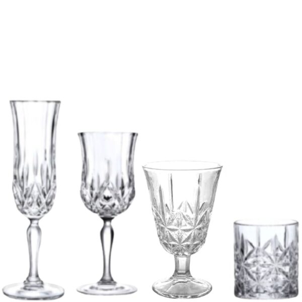 Composição; 06un Taças Champanhe com 130ml cada, 06un Taças para Vinho com 160ml cada, 06un Taças para Água ou Suco com 360ml, 06un copo para Wisky com 300ml cada.