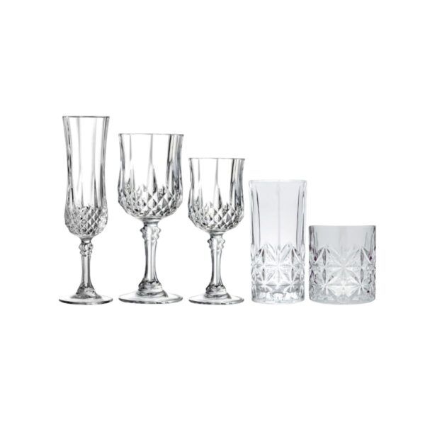 Composição : 06un Taças para Espumante de 130ml, 06un Taças para Agua de 230ml, 06un Taças para Vinho de 160ml, 06un Copos para Agua de 350ml e 06un Copos para Whisky de 300ml