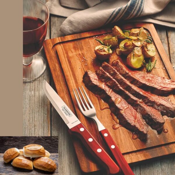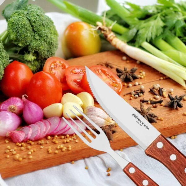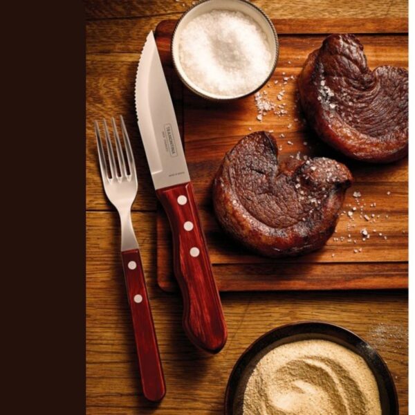 Cada peça desse conjunto foi cuidadosamente projetada para oferecer uma experiência culinária superior. As lâminas das facas, feitas de aço inoxidável de alta qualidade, são serrilhadas e afiadas com precisão, garantindo cortes suaves e perfeitos em qualquer tipo de carne. Os garfos, firmes e robustos, são ideais para manipular e servir as suculentas peças grelhadas com facilidade.