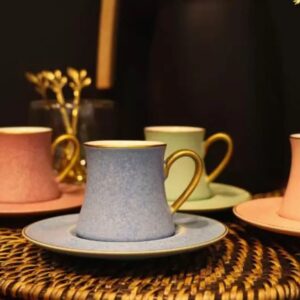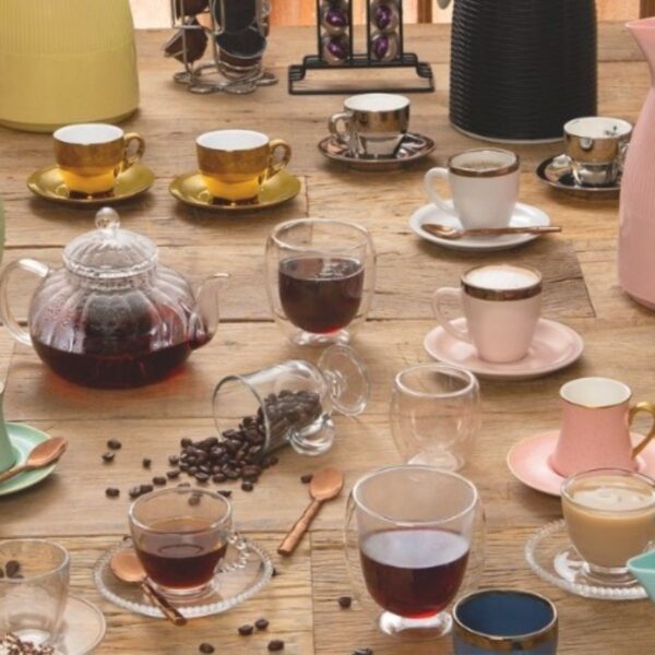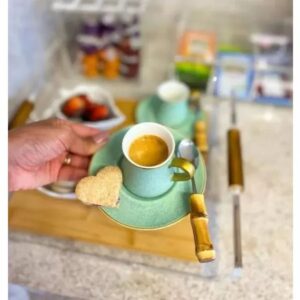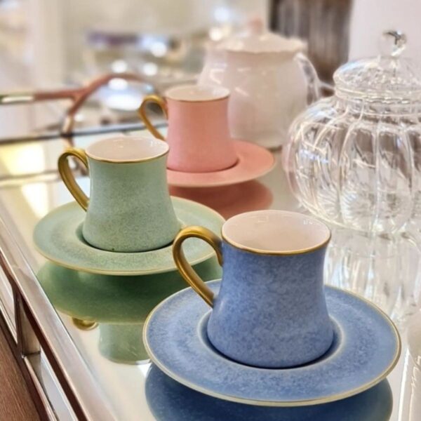 Cada conjunto inclui 6 xícaras, cada uma com 80ml. Os pires de 12 cm completam a apresentação, tornando-o ideal para encontros casuais ou para receber visitas com estilo.