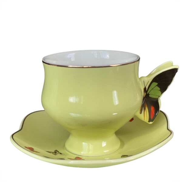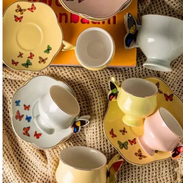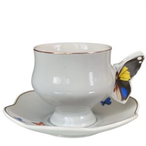 Conjunto 4 xícaras para cafe com pires de porcelana colorida Papillon 80ml em porcelana são ideais para servir o cafe.. Com pires e xícara enfeitados com borboletas na borda esta xicara traz originalidade e beleza à sua mesa.