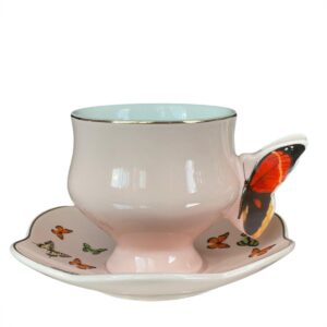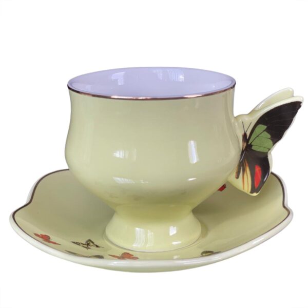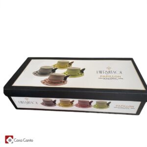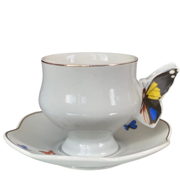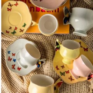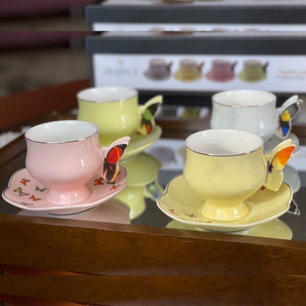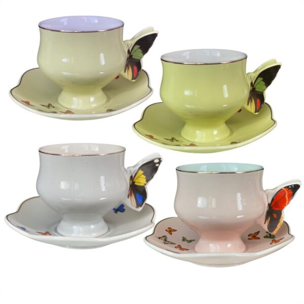 Conjunto 4 xícaras para chá com pires de porcelana colorida Papillon 200ml em porcelana são ideais para a hora do chá. Com pires e xícara enfeitados com borboletas na borda é ideais para servir o chá à qualquer hora do dia.
