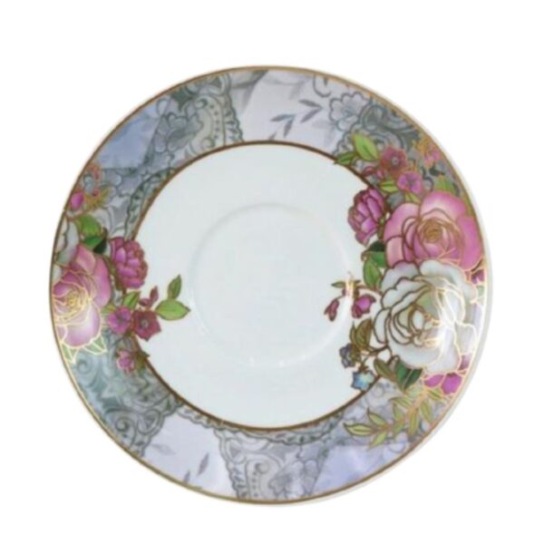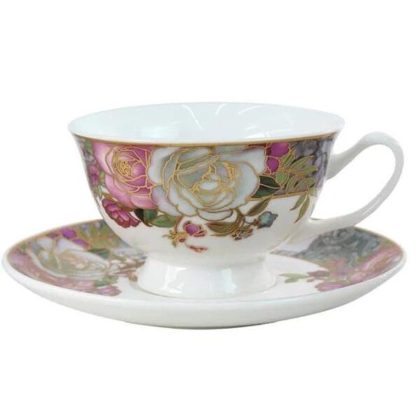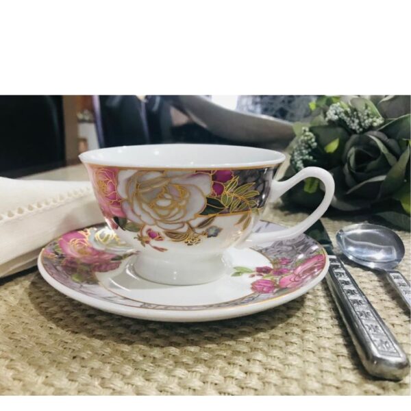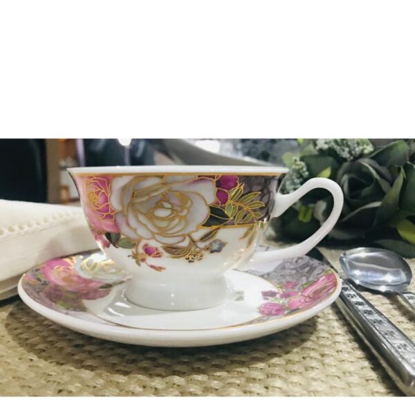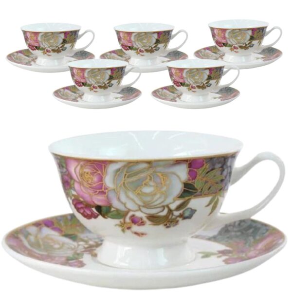 Xícara de chá de porcelana floral com fio dourado. Possui design clássico e elegante. Perfeito para hora do chá.Composição: 6un xícaras com 200ml cada e 6un pires.