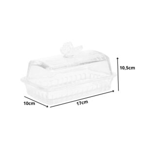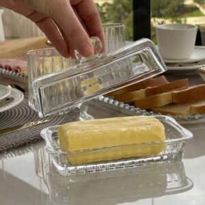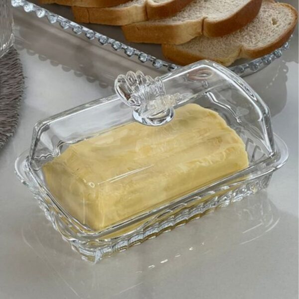 A tampa da manteigueira é uma obra de arte por si só, com um pegador delicadamente esculpido em forma de borboleta, evocando uma sensação de leveza e beleza. Fabricada em vidro transparente de alta qualidade, ela não só permite uma visão clara do conteúdo, facilitando a identificação, mas também empresta uma aura de requinte à sua apresentação culinária.