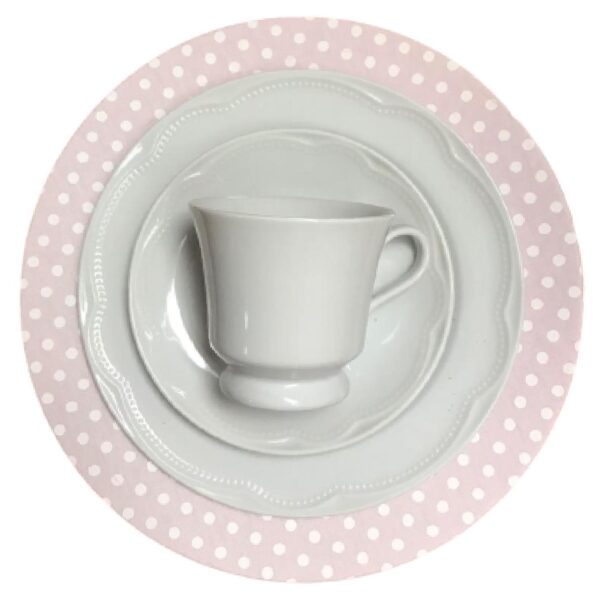 Composição: 06 Pratos Sobremesa de 20cm, 06 Xicaras para Cha de 200ml  e 06 Pires, 06 Souplat de 26cm de diametro sendo Capa de Tecido Rosa com Bolinhas Brancas e Suporte de Compensado de Madeira.