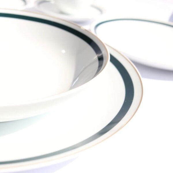 A borda verde e o filete dourado trazem uma sofisticação única, tornando cada refeição especial. Seja para um jantar formal ou um almoço casual, esses pratos são a escolha perfeita.