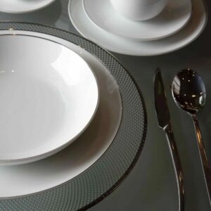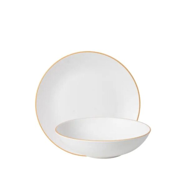 Este Jogo de Prato Fundo em Porcelana Branca, adornado com requintados filetes de ouro Legacy Gold, é uma manifestação de elegância e sofisticação da marca renomada L’Hermitage.