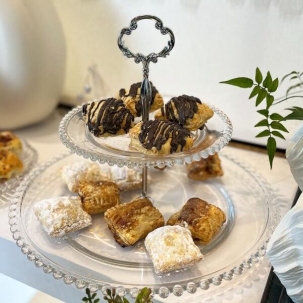 O prato duplo de cristal transparente para doces PEARL possui lapidação em bolinhas na borda, inspirada na beleza e no brilho único das pérolas. É perfeito para destacar a sobremesa, proporcionando sofisticação no momento de receber os convidados ou aproveitar o momento em família.