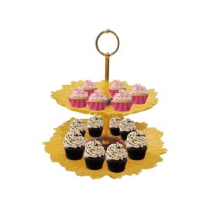 O prato para bolo possui um design em formato de girassol, com uma base de 28,5 cm de diâmetro e uma parte superior de 26 cm, criando uma presença visual marcante.